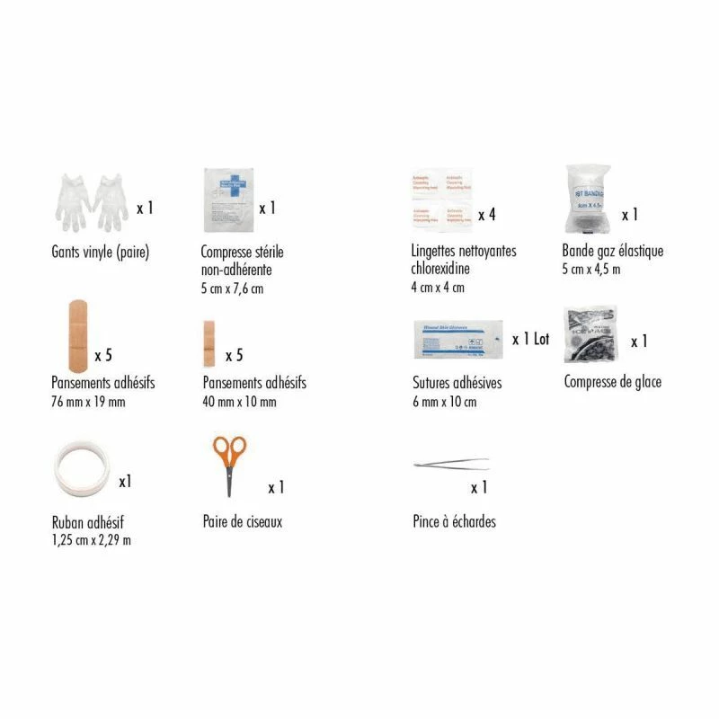- 4 compresses d’alcool 3,5 cm x 3,5 cm 10 pansements adhésifs 40 mm x 10 mm